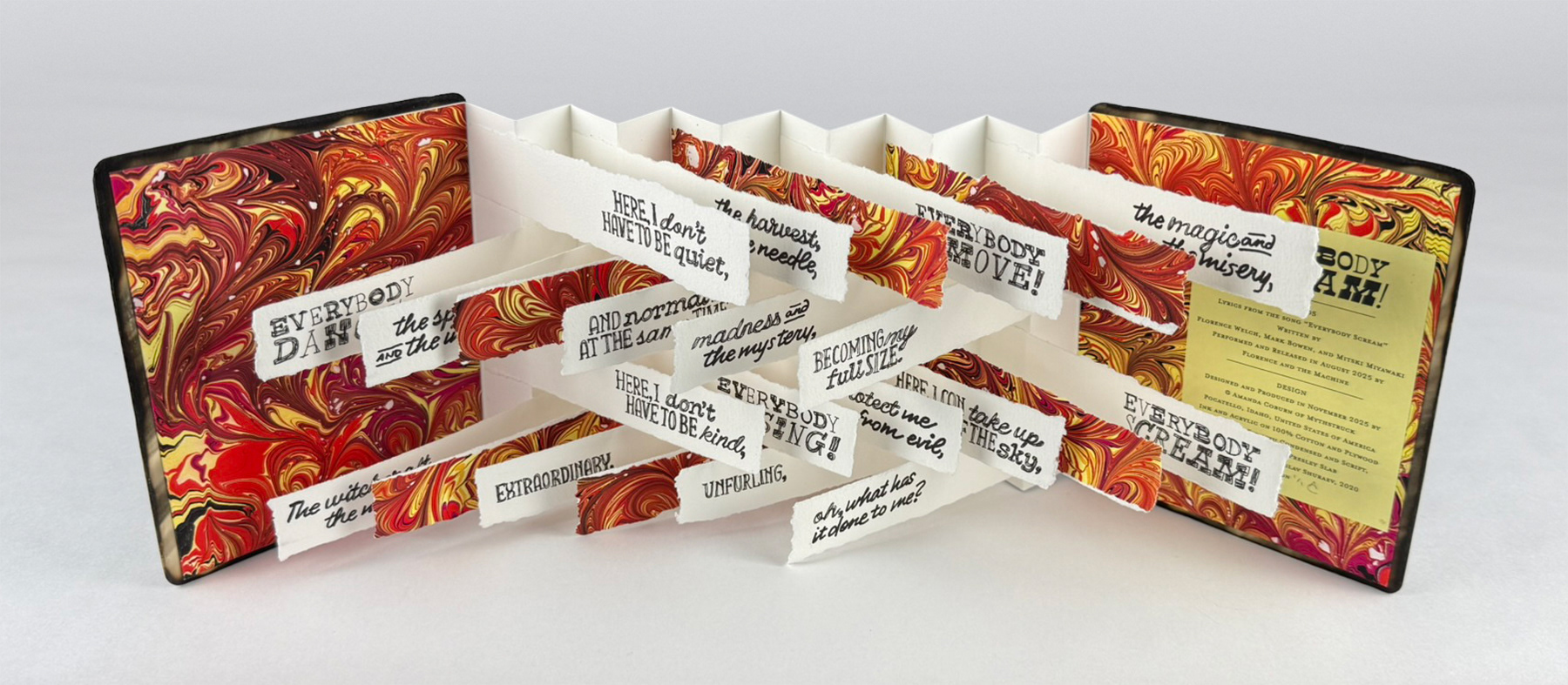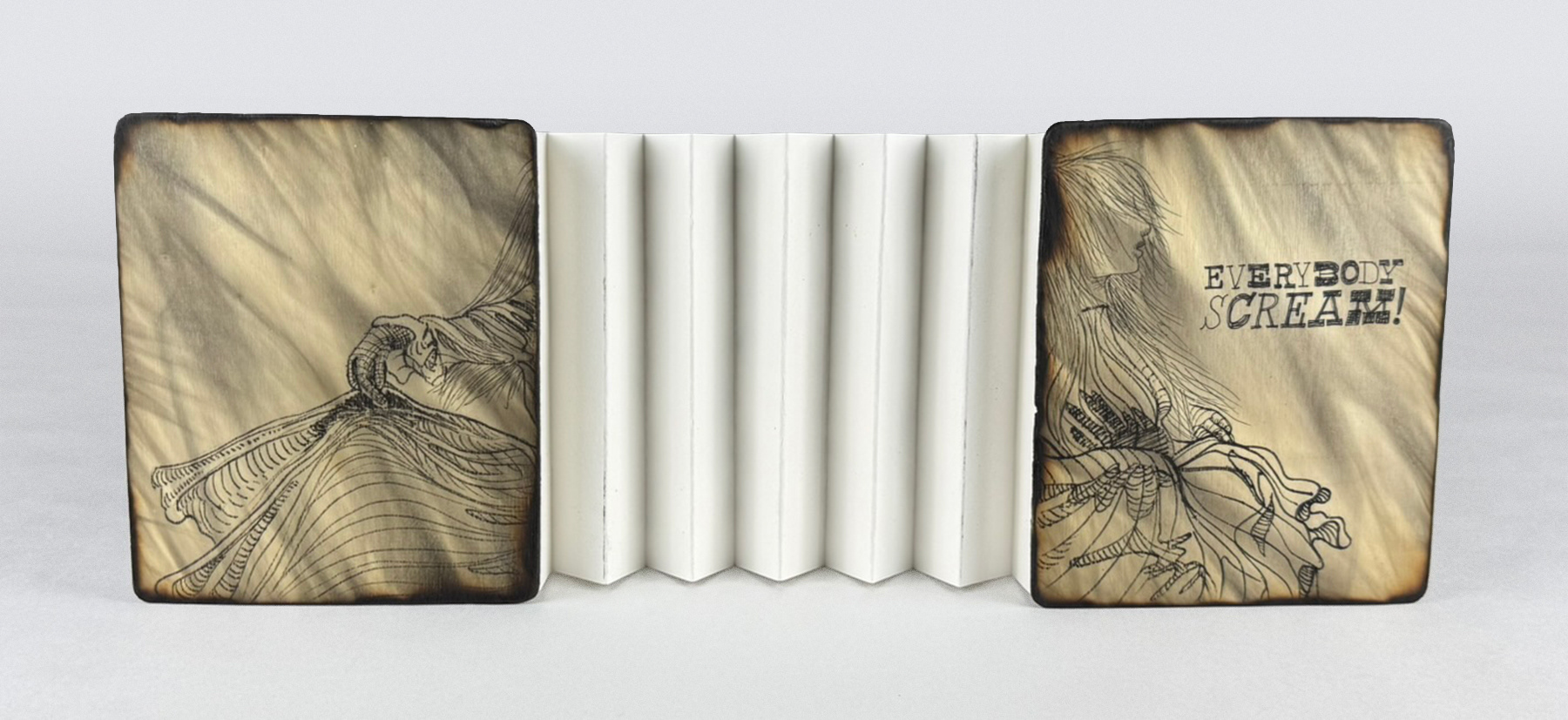 Coburn, Amanda Noel. Everybody Scream!. 2025. Ink, acrylic, and matches on hand-marbled paper and wood. 22 by 6 in. (Closed: 5 by 6 in.)
