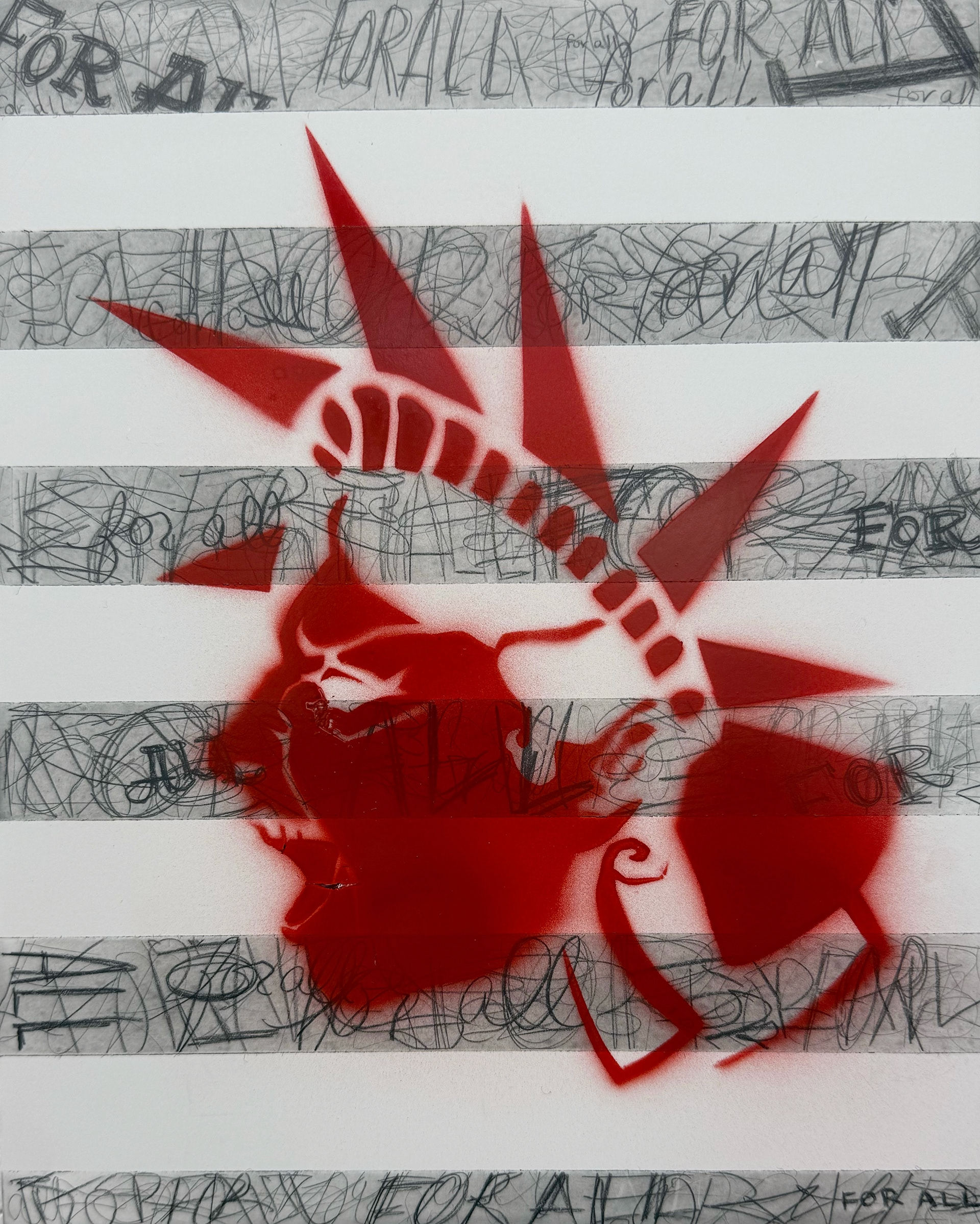 Coburn, Amanda Noel. "For All." 2025. Spray paint and graphite on wood panel, 8 by 10 in.