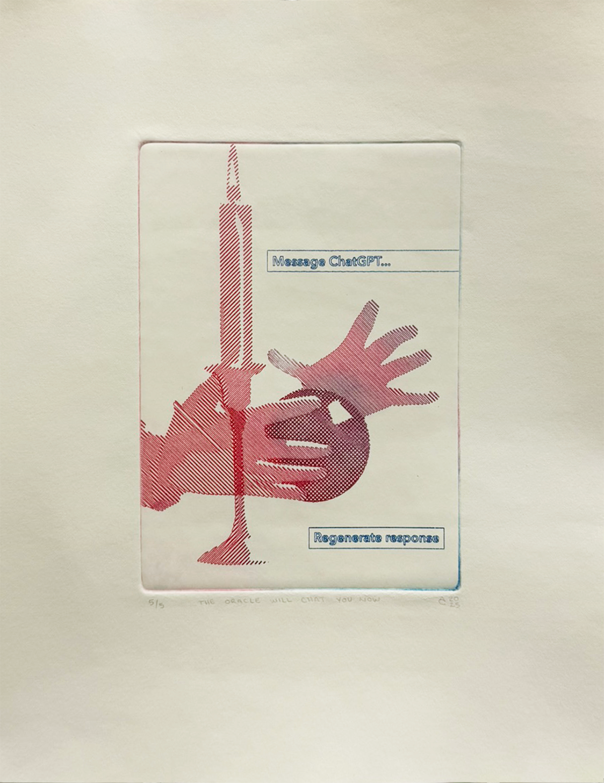 Coburn, Amanda Noel. The Oracle Will Chat You Now. 2025. Cranfield Caligo Safe Wash Etching Ink on Legion Stonehenge paper in natural. 11 by 14 in.